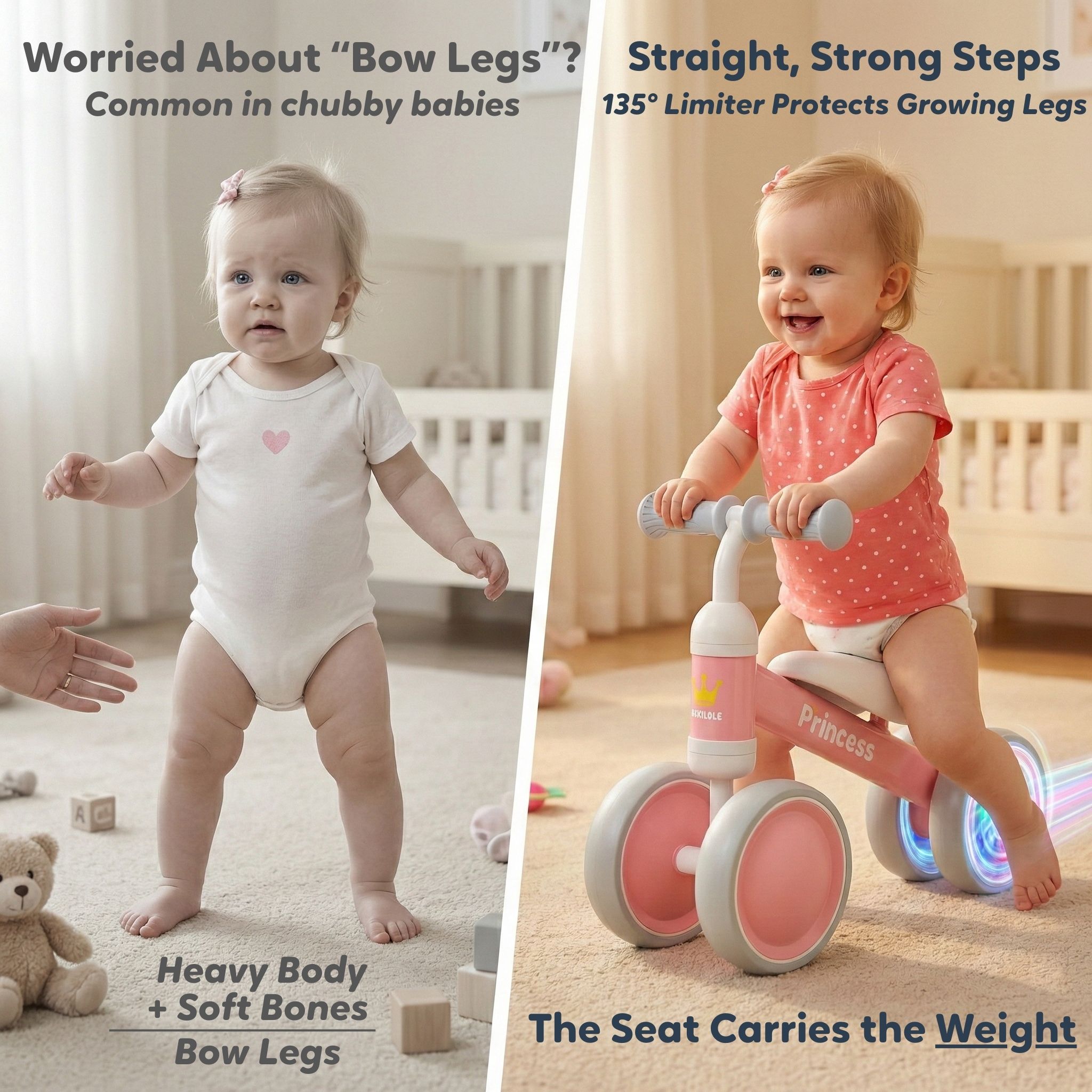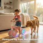 MAGICAL KINETIC LED WHEELS (NO BATTERIES) Watch her face light up as her wheels glow! Our motion-activated LED light-up wheels use magnetic energy to sparkle as she glides—no batteries or charging required. This visual reward system encourages physical activity, accelerating the development of motor skills and coordination. It’s the “wow-factor” feature that distinguishes Bekilole as the premier 1st birthday girl gift, providing endless battery-free enchantment.