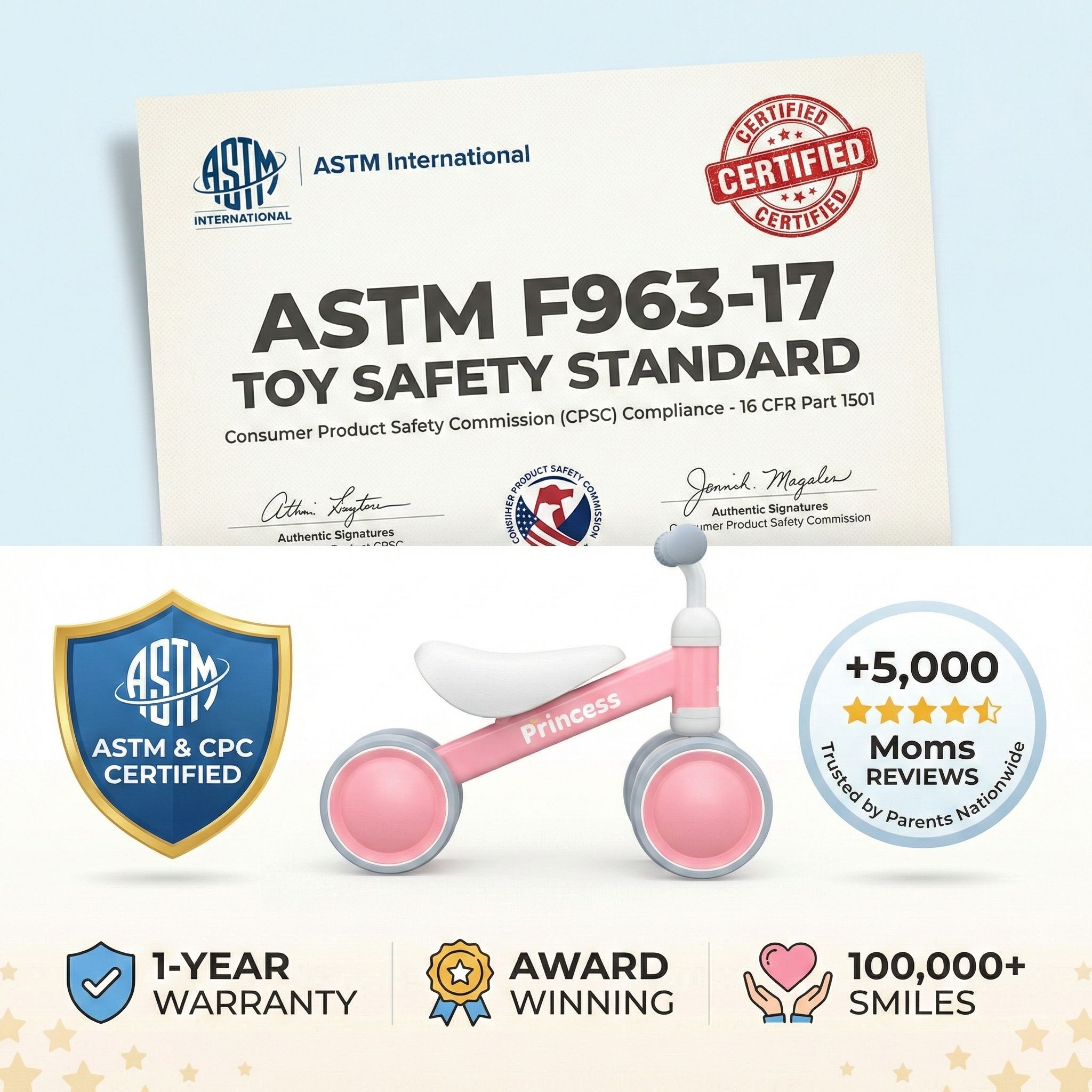 CERTIFIED SAFETY & 135° TIP-PREVENTION Safety is our royal priority. Engineered with a 135-degree safety steering limit, preventing sharp turns and side-tipping—the #1 concern with standard walkers. ASTM F963 certified and built with a fully enclosed 4-wheel chassis, it ensures tiny feet never get caught, providing a stable foundation that allows her to explore as a 1 year old baby girl with absolute confidence and parent-approved protection.