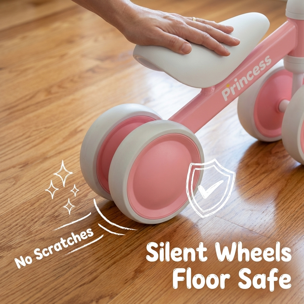SILENT EVA TIRES FOR INDOOR ADVENTURES Protect your palace floors with premium silent EVA foam wheels. Designed to be whisper-quiet on hardwood, tile, and laminate, these tires ensure a scratch-free ride throughout your home. This floor-safe design makes it the perfect indoor outdoor toddler ride on toy, allowing her to transition from a living room cruise to a sidewalk adventure without missing a beat. The ultimate montessori toy for 1 year old girls